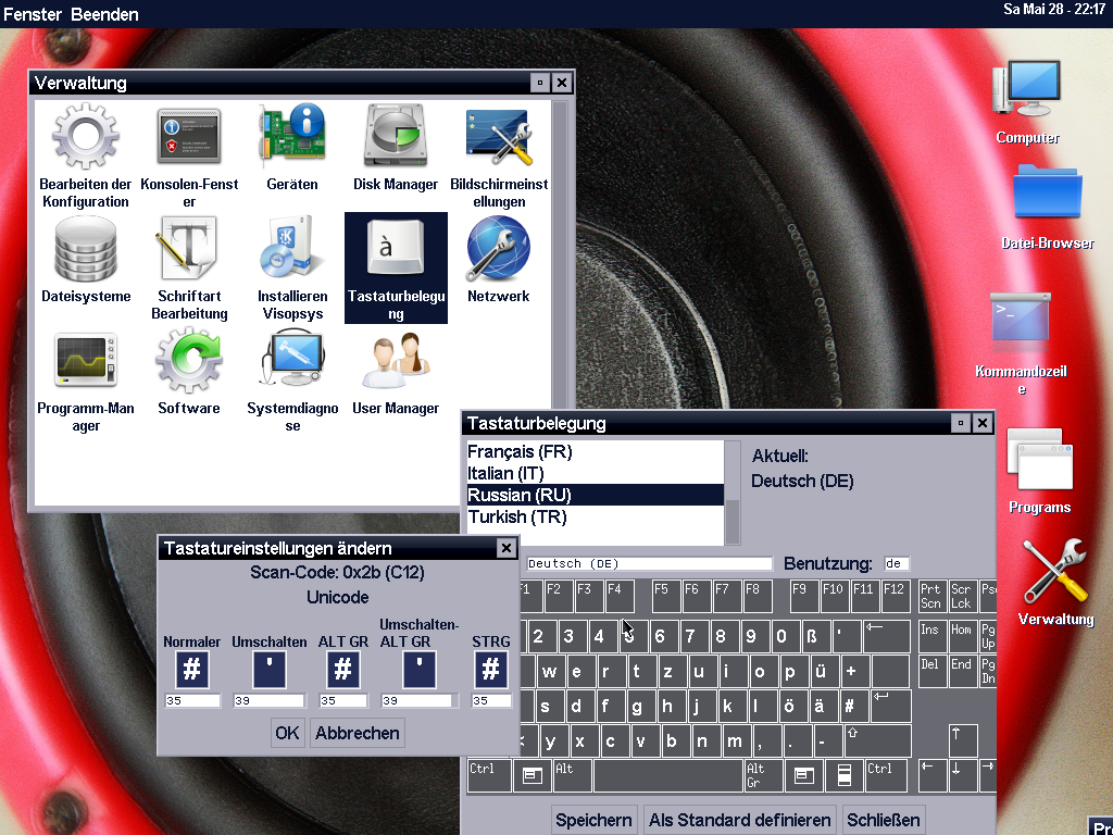 Installing to a hard drive is straight forward: Optionally choose a language other than English (this also changes the keyboard layout), coose a partition, click a few next buttons, enter a password for the default user account and reboot. There is also a partitioning tool available from the installer. But I didn't find a way go get back to the installer without rebooting. After booting the installed Visopsys and logging in, or after booting in live mode, you get a simple desktop with a few icons and a task bar at the top.
